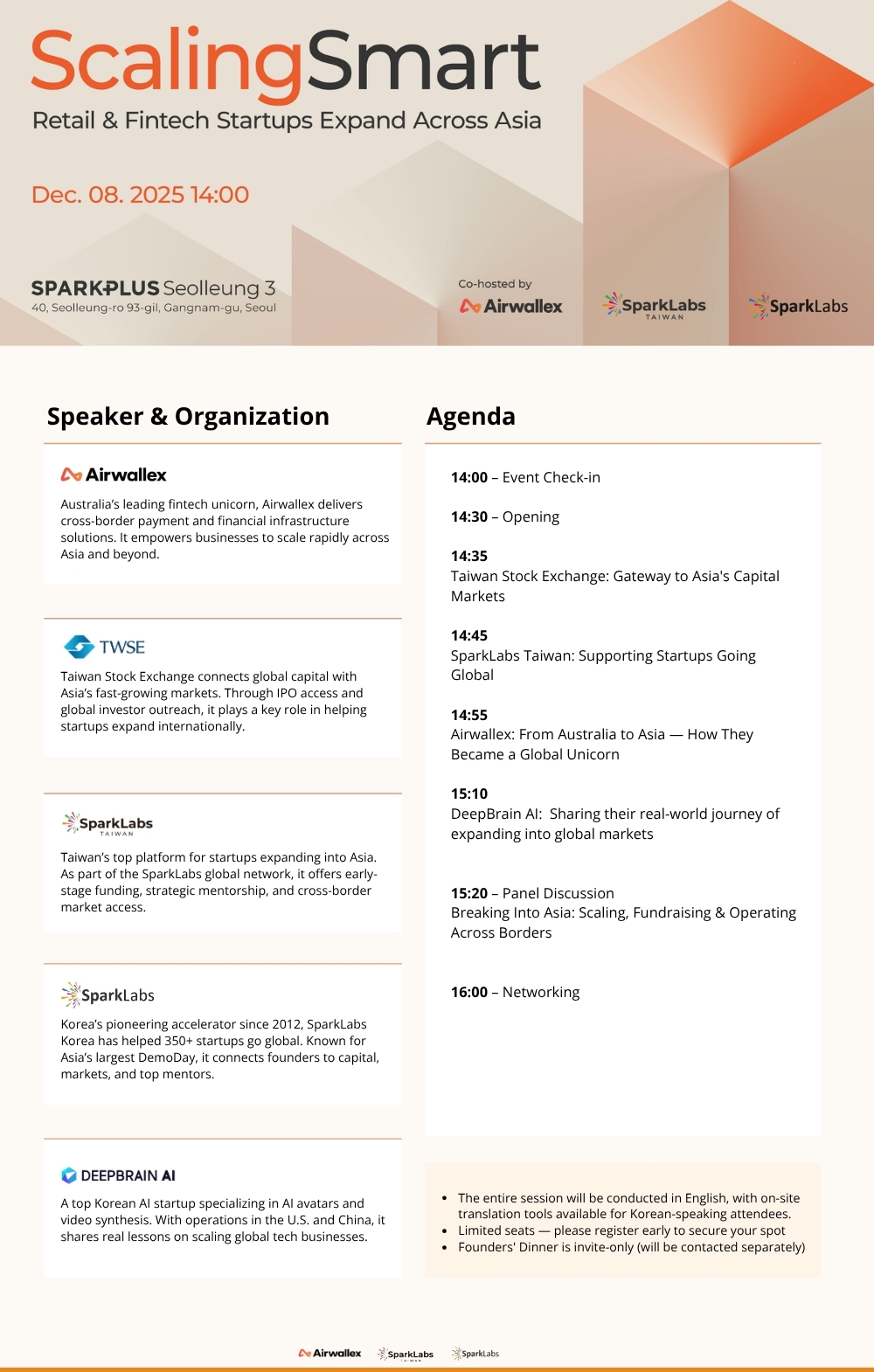 글로벌 핀테크 유니콘 Airwallex의 확장 전략, SparkLabs Taiwan과 대만증권거래소(TWSE)가 전하는 아시아 자본시장 인사이트, 그리고 한국 스타트업의 글로벌 진출 사례까지, 아시아로 스케일업하기 위해 꼭 알아야 할 핵심 인사이트를 한 자리에서 들으실 수 있습니다.